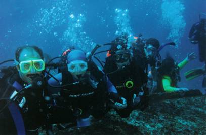 Foto 4. Miembros de la primera generación de arqueólogos subacuaticos buceando un barco hundido en Cancún